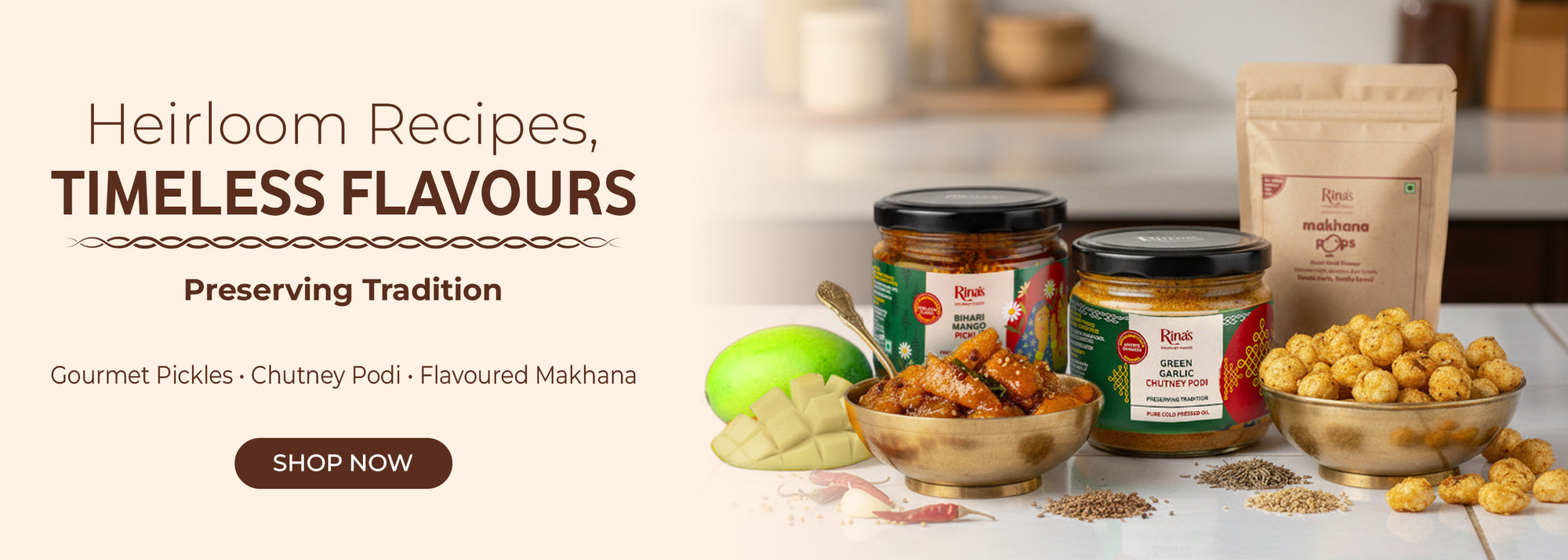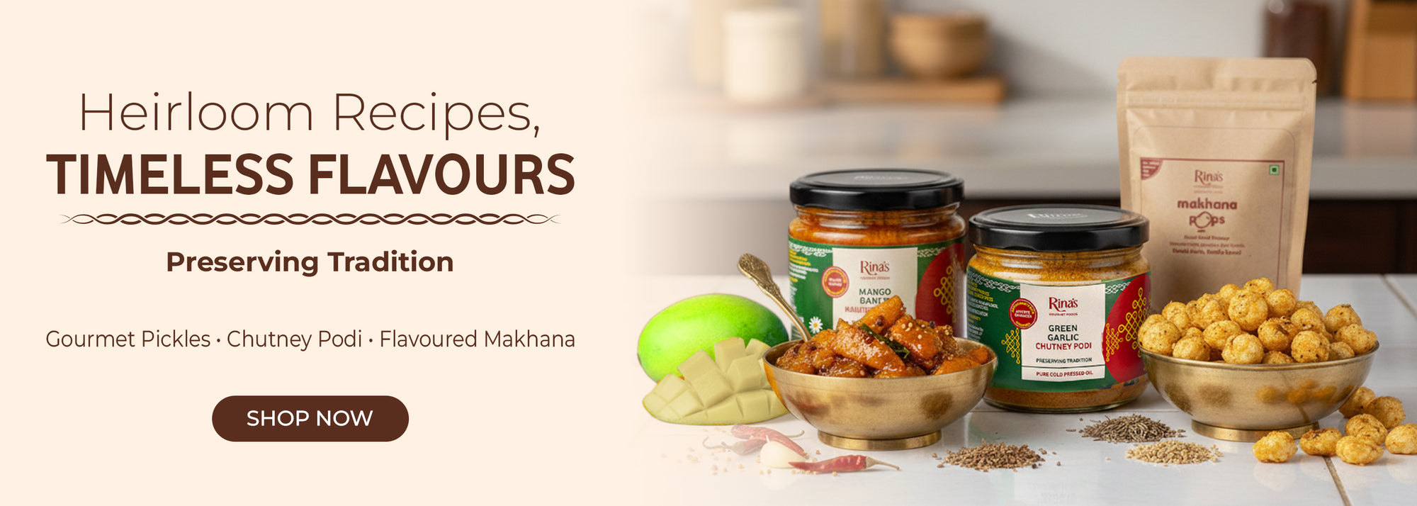 Rina’s Gourmet Foods is a celebration of authentic Indian flavours, crafted the way food is meant to be slow, honest, and full of care. From traditional pickles and chutney podi to wholesome makhana snacks, every product is handmade in small batches using organic, thoughtfully sourced ingredients.